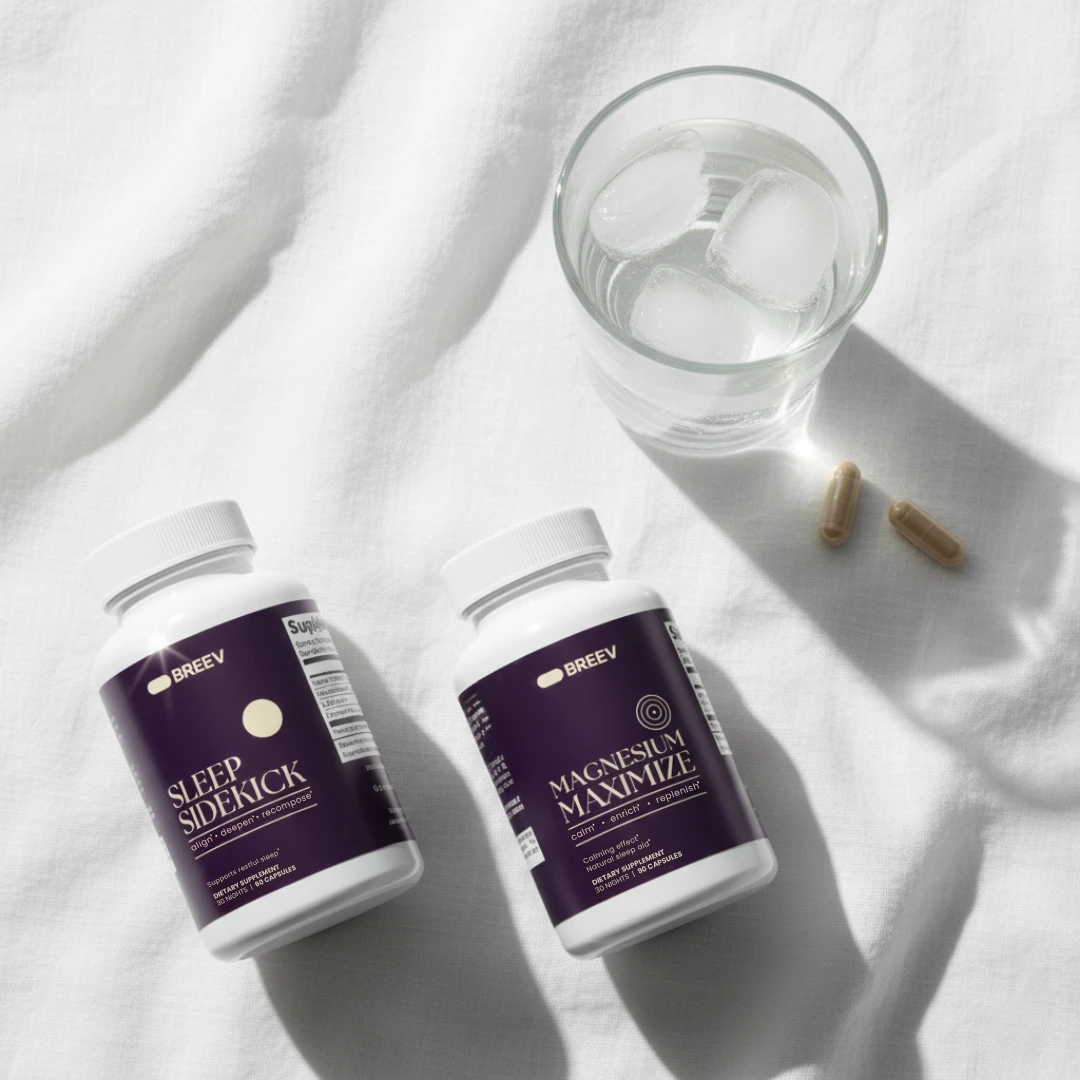 Breev is a complete two-phase sleep system: high-purity magnesium glycinate for deep relaxation, plus our unique targeted sleep blend with melatonin, L-tryptophan, valerian, and lemon balm (+ more) for sustained, restorative sleep cycles*